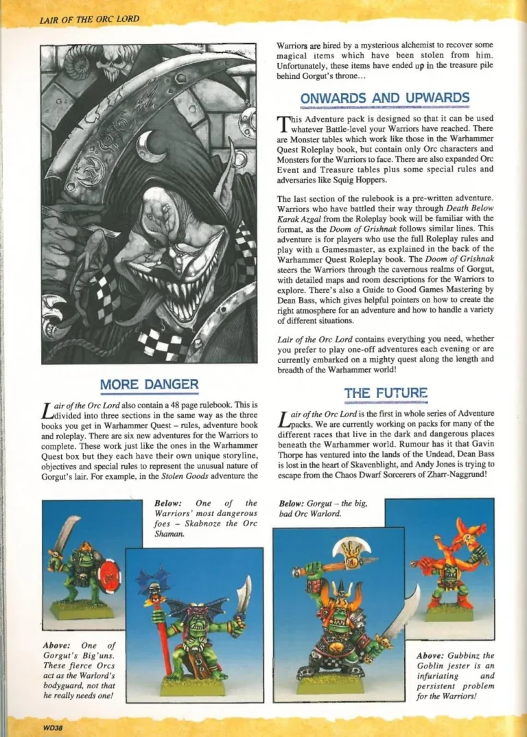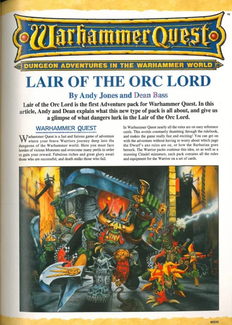 L’une des extension mythiques de Warhammer Quest, quasiment introuvable en France ajoutait 6 nouvelles aventures, de nouveaux trésors, objets magiques et tables de monstres, des tuiles représentant le domaine du Seigneur orque ainsi que 8 figurines en métal (Gorgut et sa bande)