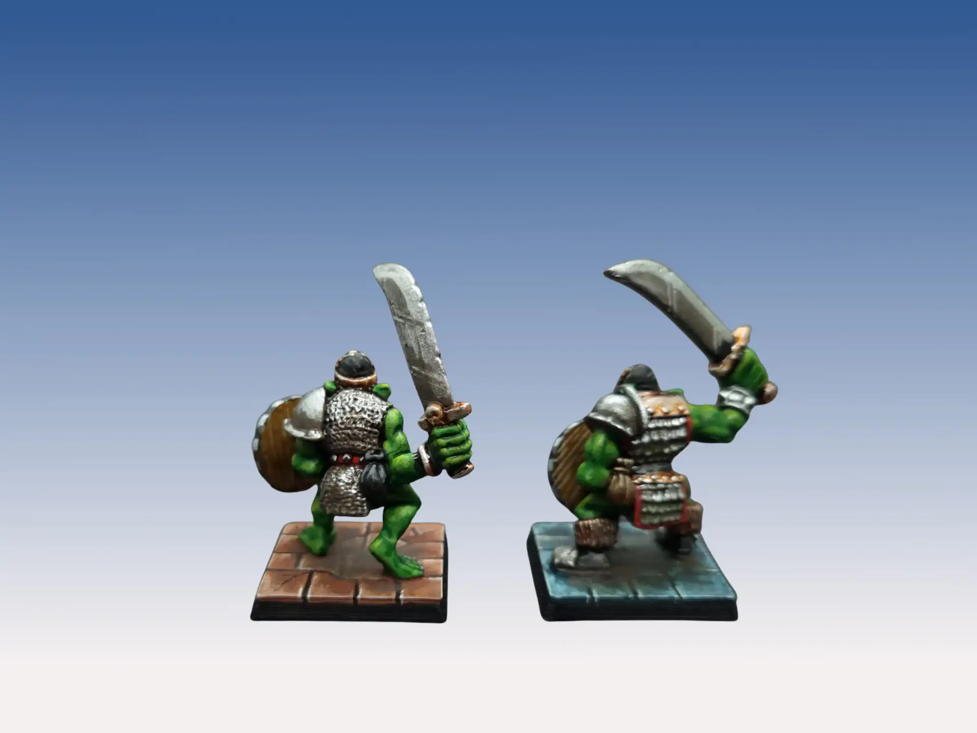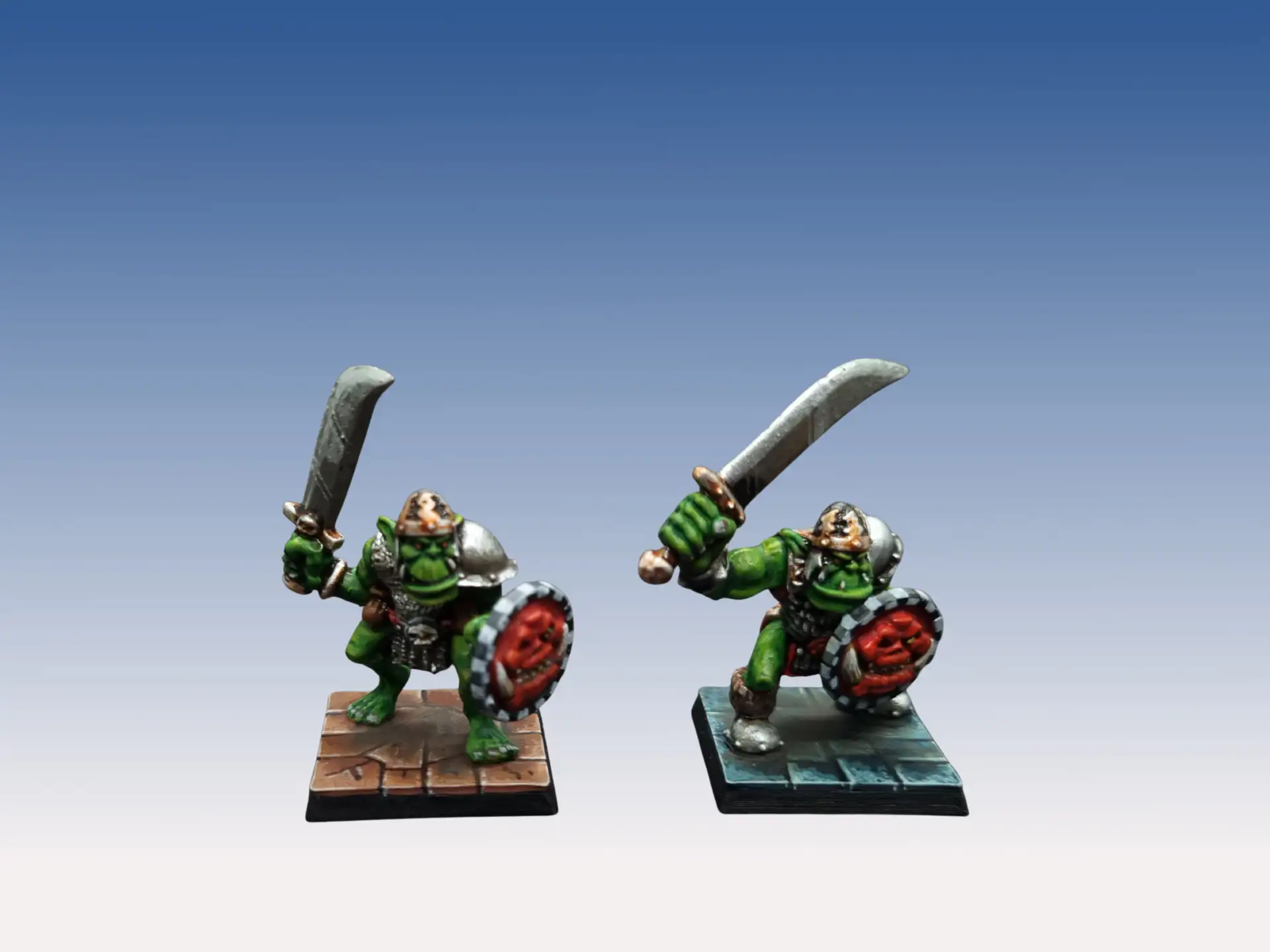 Note : les kostos d’origine ont un bouclier nu, que je n’avais plus. J’ai donc remplacé par des boucliers avec un motif en relief, mais j’ai peint celui-ci de manière à ce que le motif soit intégré, de la même manière que le bouclier embossé des orques plastiques monobloc.
